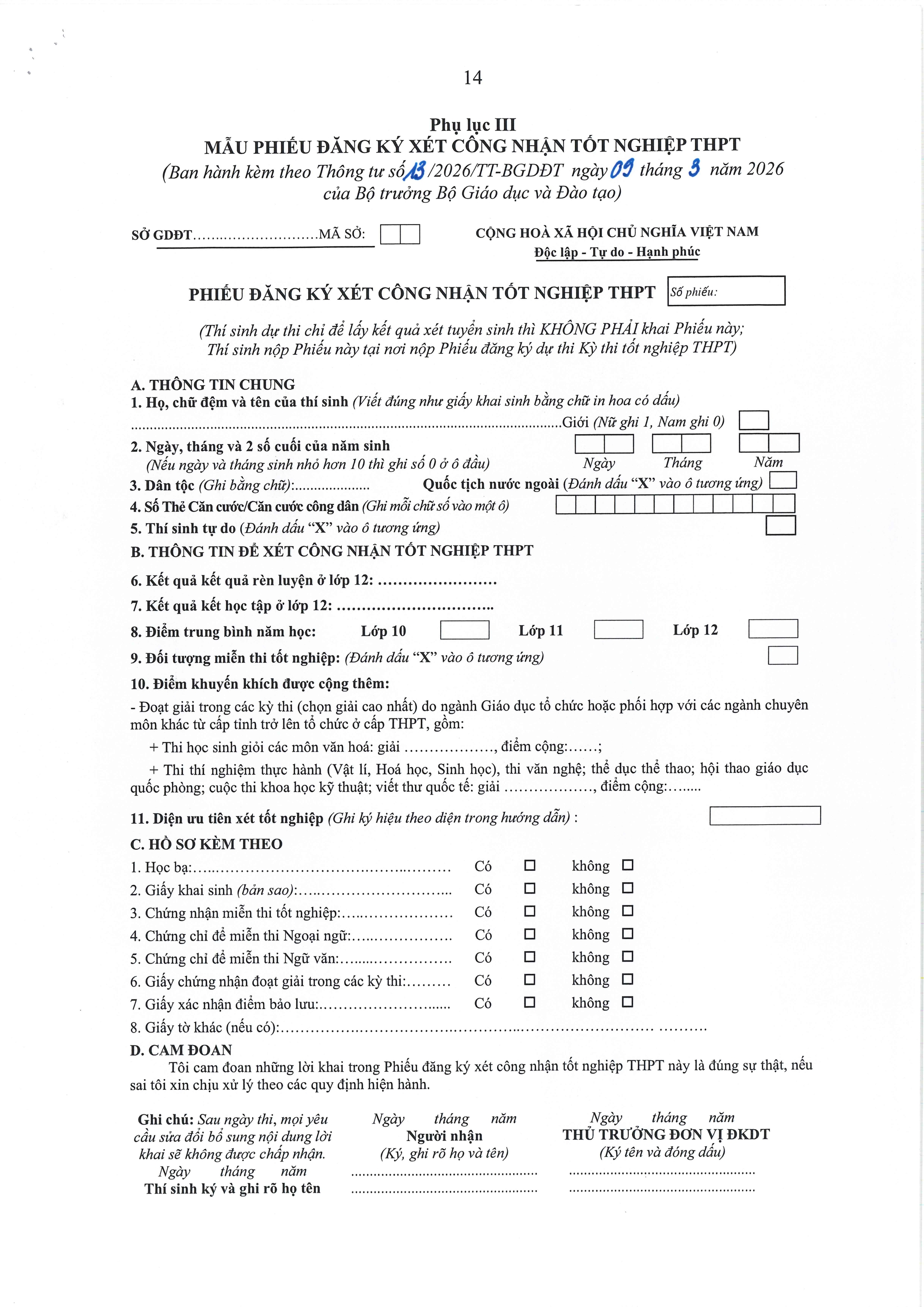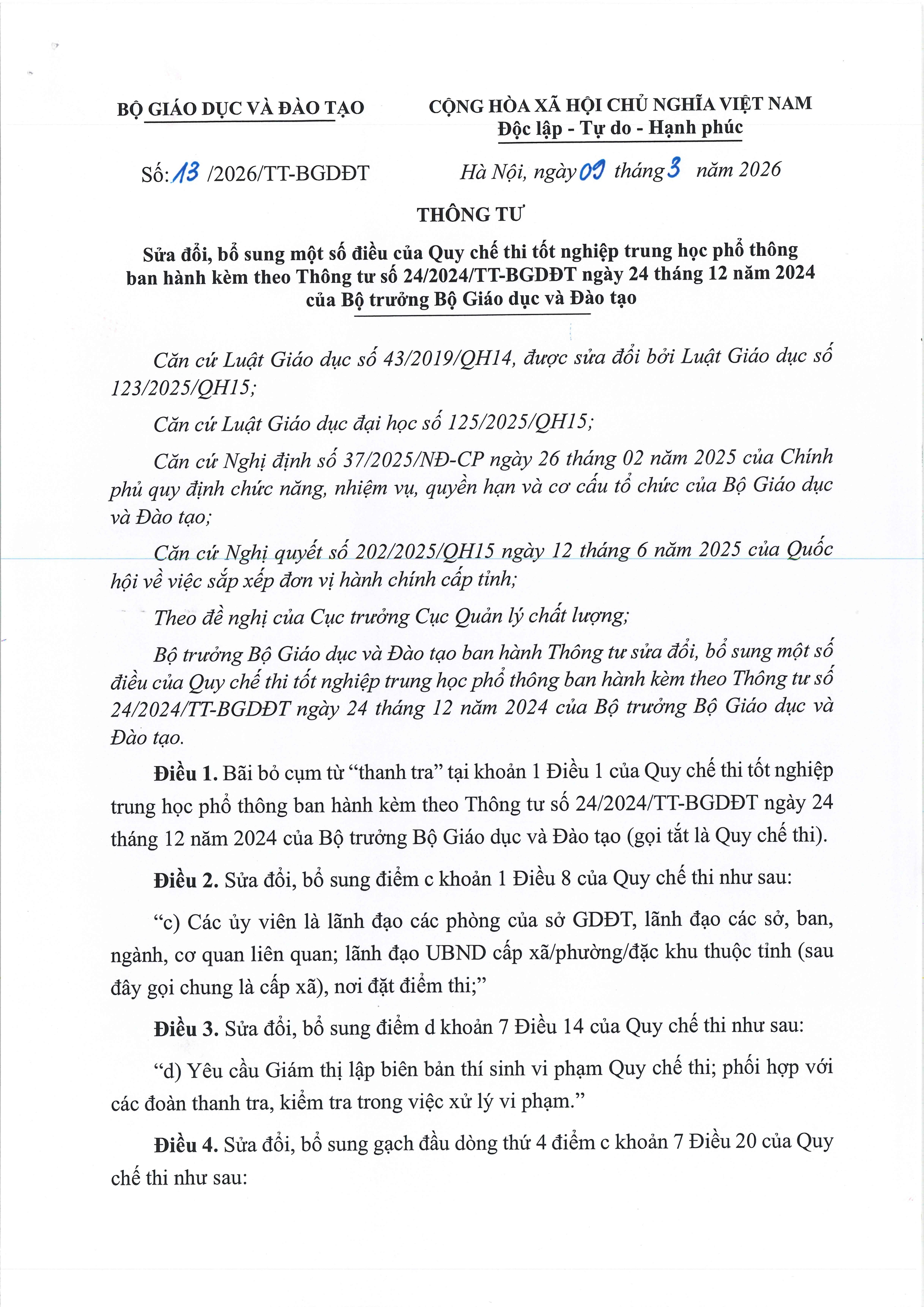 Ngày 09/3/2026, Bộ Giáo dục và Đào tạo ban hành Thông tư số 13/2026/TT-BGDĐT sửa đổi, bổ sung một số điều của Quy chế thi tốt nghiệp trung học phổ thông ban hành kèm theo Thông tư số 24/2024/TT-BGDĐT. Thông tư mới được ban hành nhằm hoàn thiện các quy định liên quan đến công tác tổ chức kỳ thi tốt nghiệp THPT, đồng thời bảo đảm phù hợp với những thay đổi trong hệ thống quản lý nhà nước, đặc biệt là hoạt động thanh tra, kiểm tra.