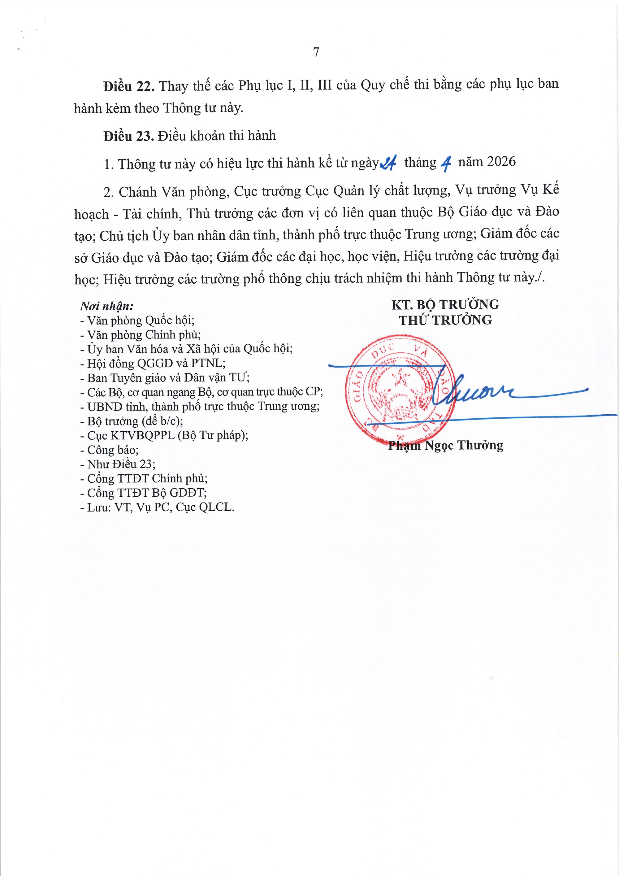Thông tư số 13/2026/TT-BGDĐT có hiệu lực thi hành từ ngày 24/4/2026. Các quy định mới sẽ được áp dụng trong quá trình tổ chức kỳ thi tốt nghiệp THPT thời gian tới, góp phần hoàn thiện cơ chế quản lý, nâng cao chất lượng đánh giá kết quả học tập của học sinh và bảo đảm sự minh bạch, công bằng trong toàn bộ quá trình tổ chức kỳ thi.